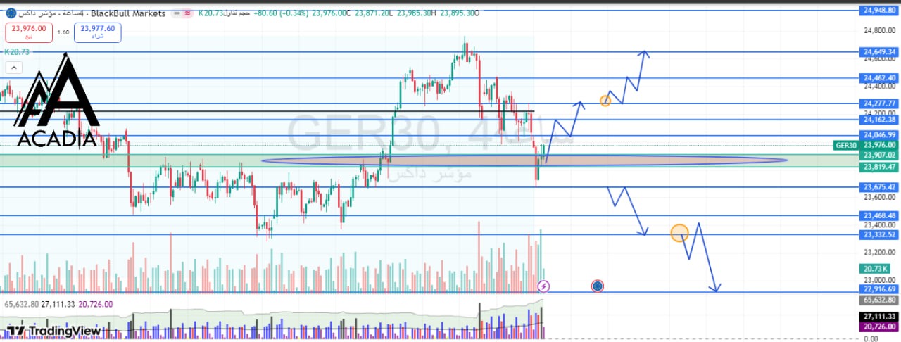 يتداول مؤشر الداكس الألماني ضمن نطاق عرضي بعد موجة هبوط قوية، حيث ارتد مؤخرًا من منطقة دعم مهمة تقع بين 23,819 – 23,946**، والتي تشكّل ارتكازًا سعريًا واضحًا على المدى القصير.