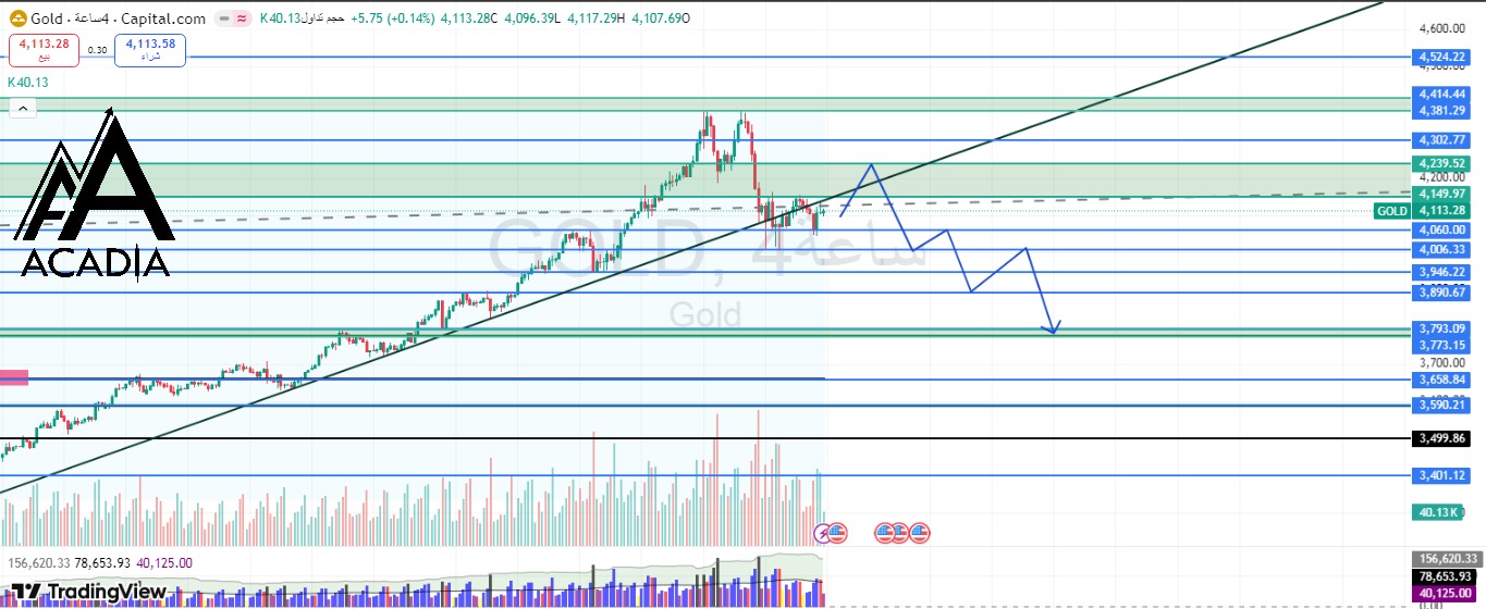 بعد التراجع من *4,240، يحاول السعر حالياً الثبات فوق **4,100*، لكن المعطيات الفنية تشير إلى احتمال صعود تصحيحي محدود بهدف إعادة اختبار الترند المكسور ضمن المنطقة الممتدة بين: