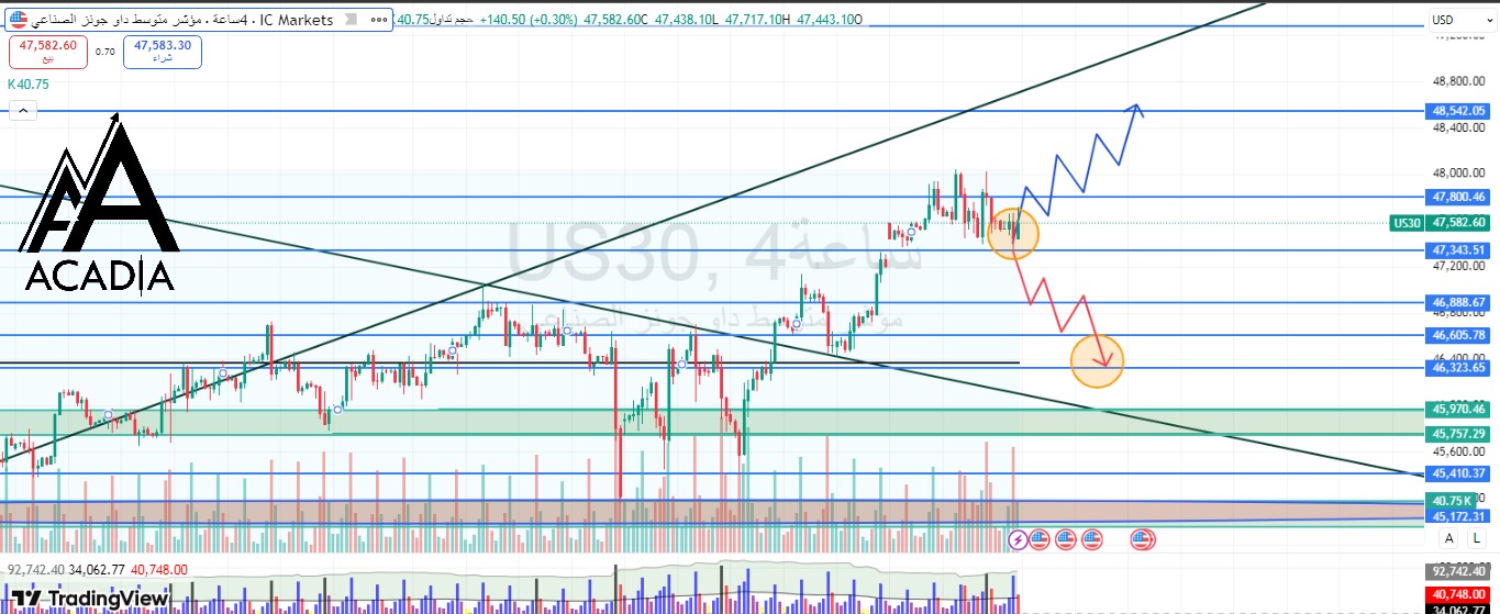 يتداول مؤشر الداو جونز حول مستوى *47,580* بعد تراجع محدود من القمة الأخيرة.