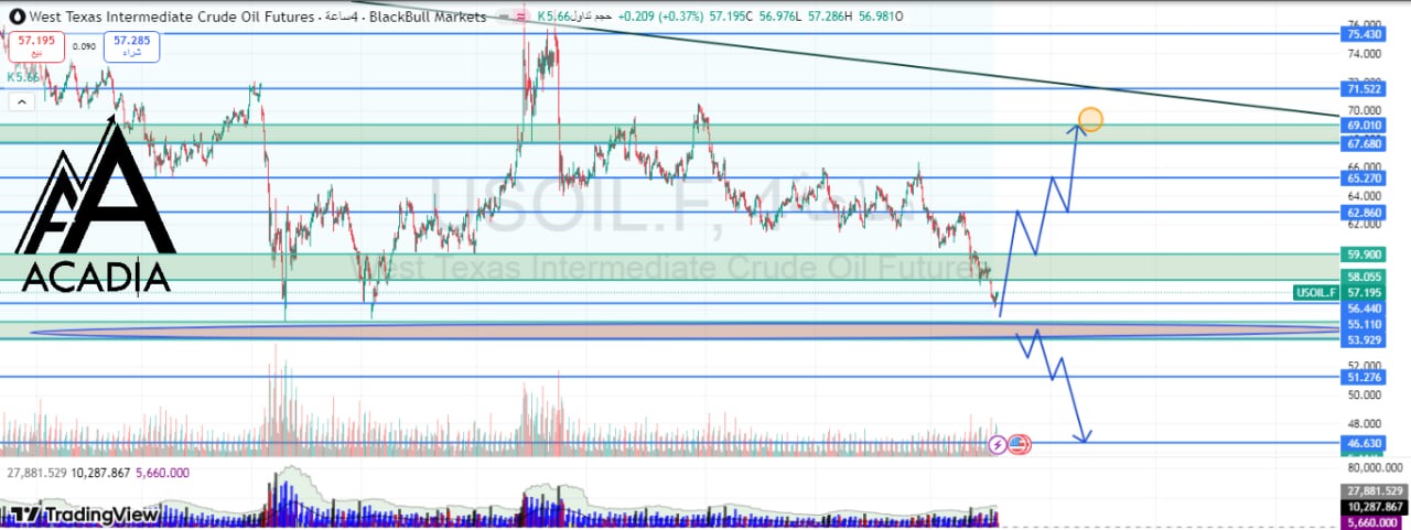 في حال استمرار الثبات أعلى *55.11 وتمكّن السعر من اختراق 58.05 – 59.90*، فإن النفط قد يشهد امتدادًا صاعدًا نحو المستويات التالية: