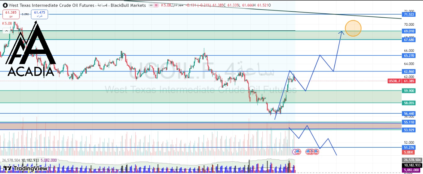 في حال استمرار السعر أعلى *58.05 – 59.90* وثباته فوق *60.00*، يُتوقّع أن يمتد الصعود نحو المستويات التالية: